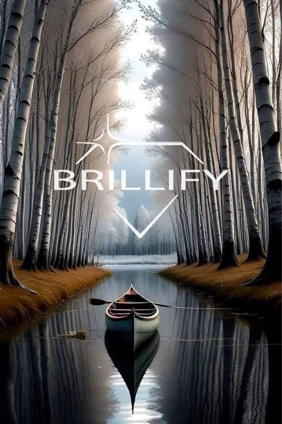 Das Bild zeigt eine prachtvolle Winterlandschaft, in einem Birkenwald und schafft eine bezaubernde Atmosphäre am Fluss.  Die präzise gedruckte Leinwand von Brillify Diamond Painting ermöglicht es dir, jedes noch so kleine Detail mit den glitzernden Harzsteinen zum Leben zu erwecken.